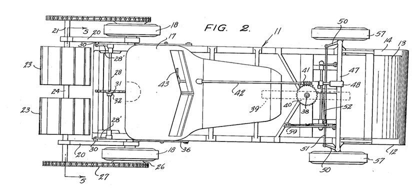 US2967578A (D2) beschreibt ein Fahrzeug mit Endloslaufband mit Trag- und Antriebseinheiten 25, mehreren Stützrädern 17, einem Längsrahmenelement 14 sowie komplexen Federungs- und Antriebsmechanismen zur Neigung und Höhenverstellung der Endloslaufbänder (vgl. Figs. 1 bis 4 der D2). Der Schwerpunkt liegt auf verstellbaren Fahrwerksstrukturen und mechanischer, hydraulischer oder gelenkbasierter Kraftübertragung.