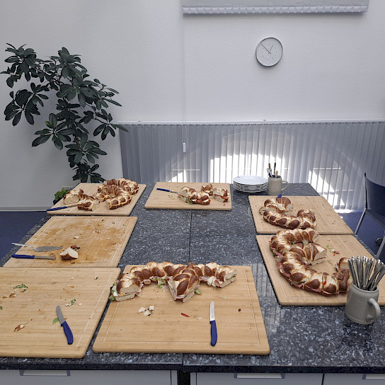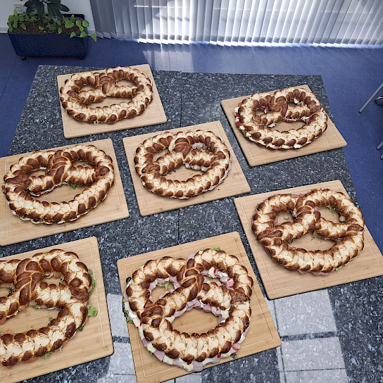 Nach einer kurzen Infoveranstaltung standen für den monatlichen Mittagstisch in der Cafeteria belegte, herzhafte Partybrezen mit Käse, Gemüse, Fisch- und Wurstspezialitäten von der Hofmetzgerei Weichsberg bereit.